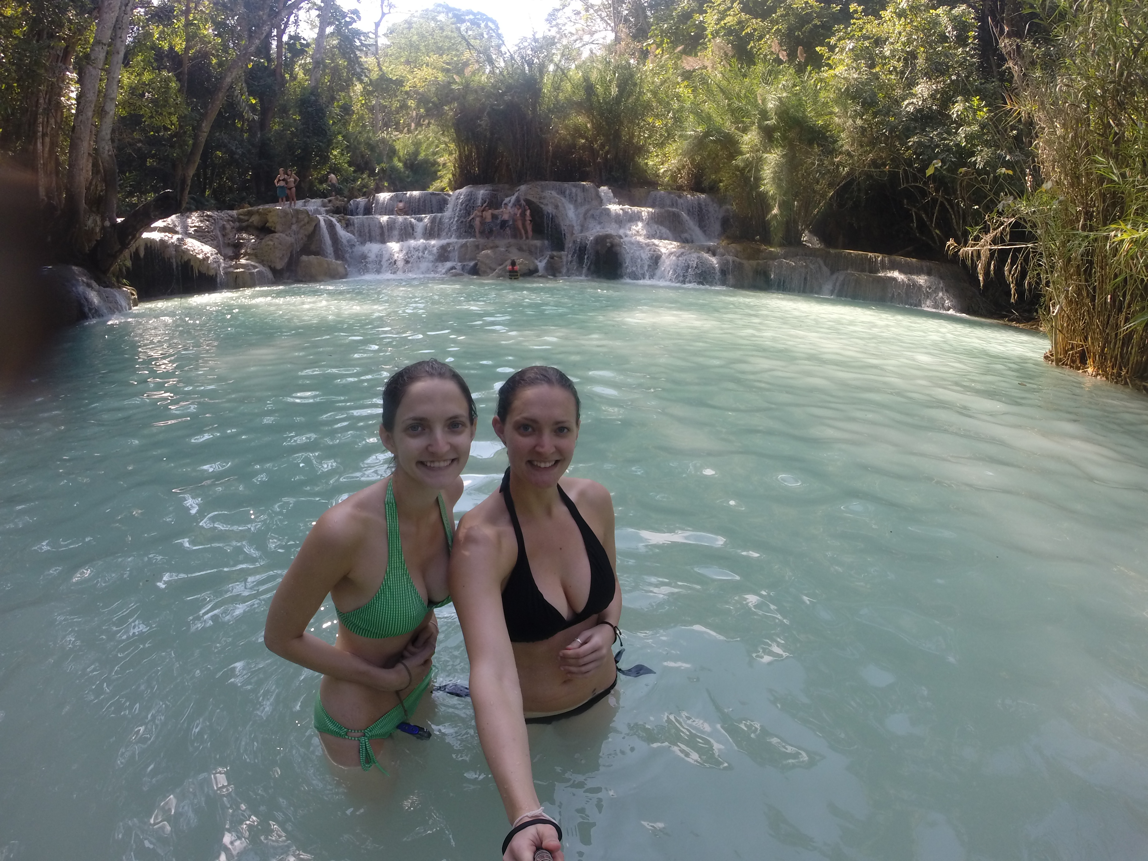 We then had a tuk tuk meet us at about 9:45am to take us to the pier to catch our long boat across the Mekong River to go up the steps to Wat Chomphet, which has a beautiful view of Luang Prabang. We also could go down in the caves and explore a bit which was a little creepy but neat. After that we caught our boat again to head down the Mekong River to the area where the Kuang Si Waterfalls are. Once we arrived we got on the traditional village transportation, a flatbed truck and headed up to where the waterfalls were. The waterfalls were absolutely beautiful and lucky for us we arrived where there weren’t TOO many tourists.