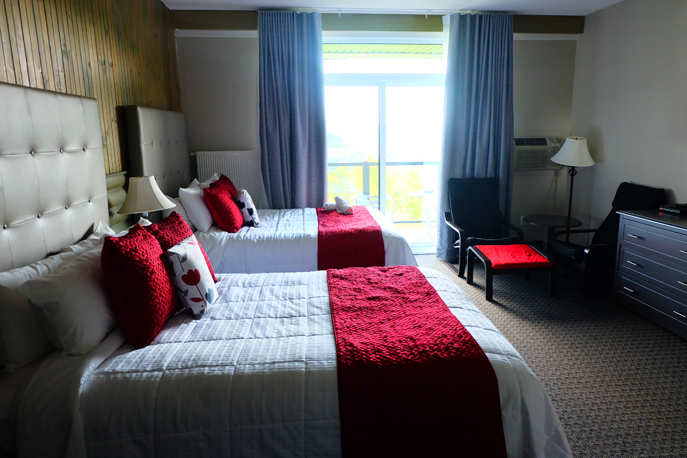 The rooms at this hotel were pretty large, which is great if you are visiting for a ski trip and have a lot of stuff. I stayed in the superior part of the hotel which are the newer, updated rooms with magnificent views of the St-Sauveur Valley. The rooms are complete with a spacious balcony, flat screen TV and a little kitchenette with a microwave, mini fridge and coffeemaker. I seriously wanted to spend all day sitting on the balcony taking in the view!