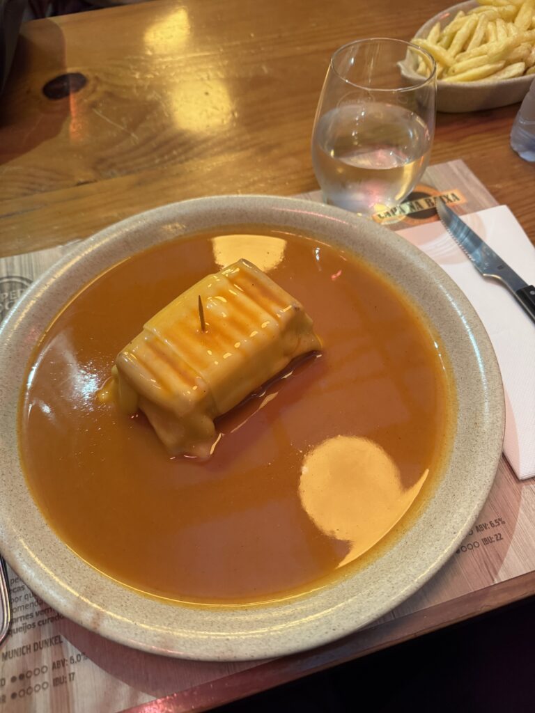 After the boat tour, you can grab some lunch. A must-try food in Porto is the famous Francesinha Sandwiches, the ultimate comfort food of Porto. A francesinha is stacked with steak, ham, and sausage, then covered in melted cheese and drenched in a rich, slightly spicy beer-based sauce. It’s usually topped with a fried egg and served with crispy fries. There are tons of restaurants that offer them on their menu, but here are a few that come highly recommended: